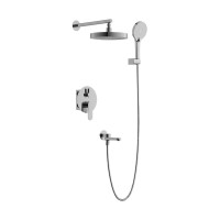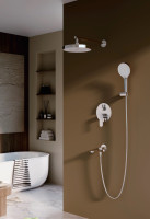 Система включает в себя шланговое подключение для смешанной воды с поворотным изливом и душевым шлангом. Излив оснащён аэратором, а его складывание служит переключателем потока воды на душевую лейку. Верхний душ диаметром 255 мм изготовлен из ABS-пластика и оснащён силиконовыми форсунками, которые легко очищаются от известкового налёта. Благодаря шарниру верхний душ можно регулировать по наклону вдоль всей оси.