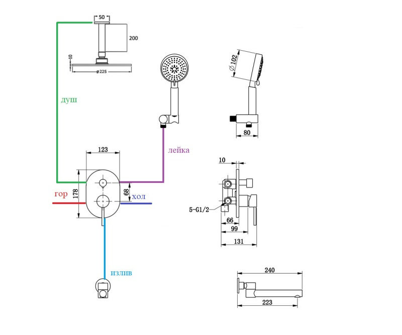 Комплектация: смеситель, верхний душ, кронштейн верхнего душа, шланговое подключение с держателем лейки, душевая лейка, шланг, излив;