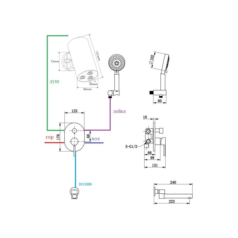Комплектация: смеситель, внутренняя часть, верхний душ, шланговое подключение с держателем лейки, душевая лейка, шланг, излив;