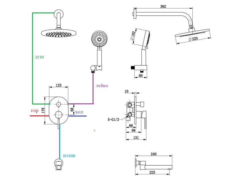 Комплектация: смеситель, верхний душ, кронштейн верхнего душа, шланговое подключение с держателем лейки, душевая лейка, шланг, излив;