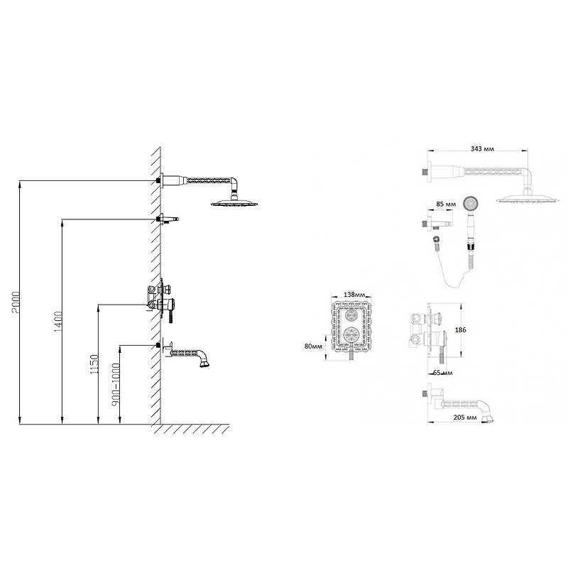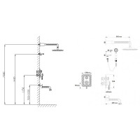 Комплектация: смеситель, верхний душ, кронштейн верхнего душа, шланговое подключение с держателем лейки, душевая лейка, шланг, излив;