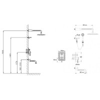 Комплектация: смеситель, верхний душ, кронштейн верхнего душа, шланговое подключение с держателем лейки, душевая лейка, шланг, излив;