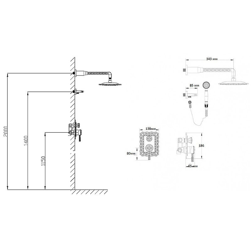 Комплектация: смеситель, верхний душ, кронштейн верхнего душа, шланговое подключение с держателем лейки, душевая лейка, шланг;