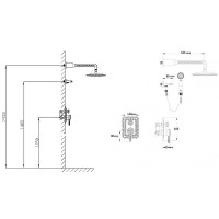 Комплектация: смеситель, верхний душ, кронштейн верхнего душа, шланговое подключение с держателем лейки, душевая лейка, шланг, излив;