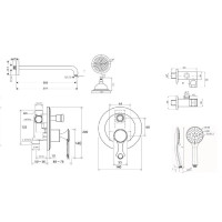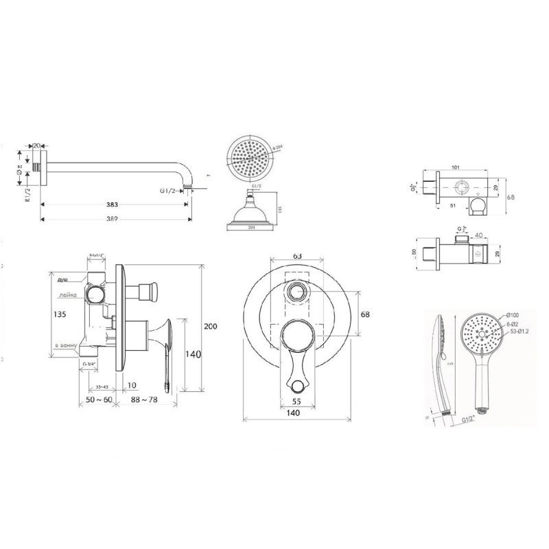 Комплектация: смеситель, внутренняя часть, шланговое подключение с держателем лейки, душевой шланг, верхний душ с кронштейном;