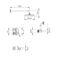 Комплектация: смеситель, верхний душ, кронштейн верхнего душа, шланговое подключение, душевая лейка, шланг, держатель душевой лейки;