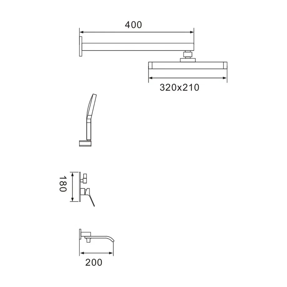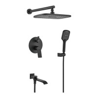 Комплектация: смеситель, внутренняя часть, шланговое подключение с изливом, верхний душ с настенным кронштейном, душевая лейка, настенный держатель лейки, душевой шланг;