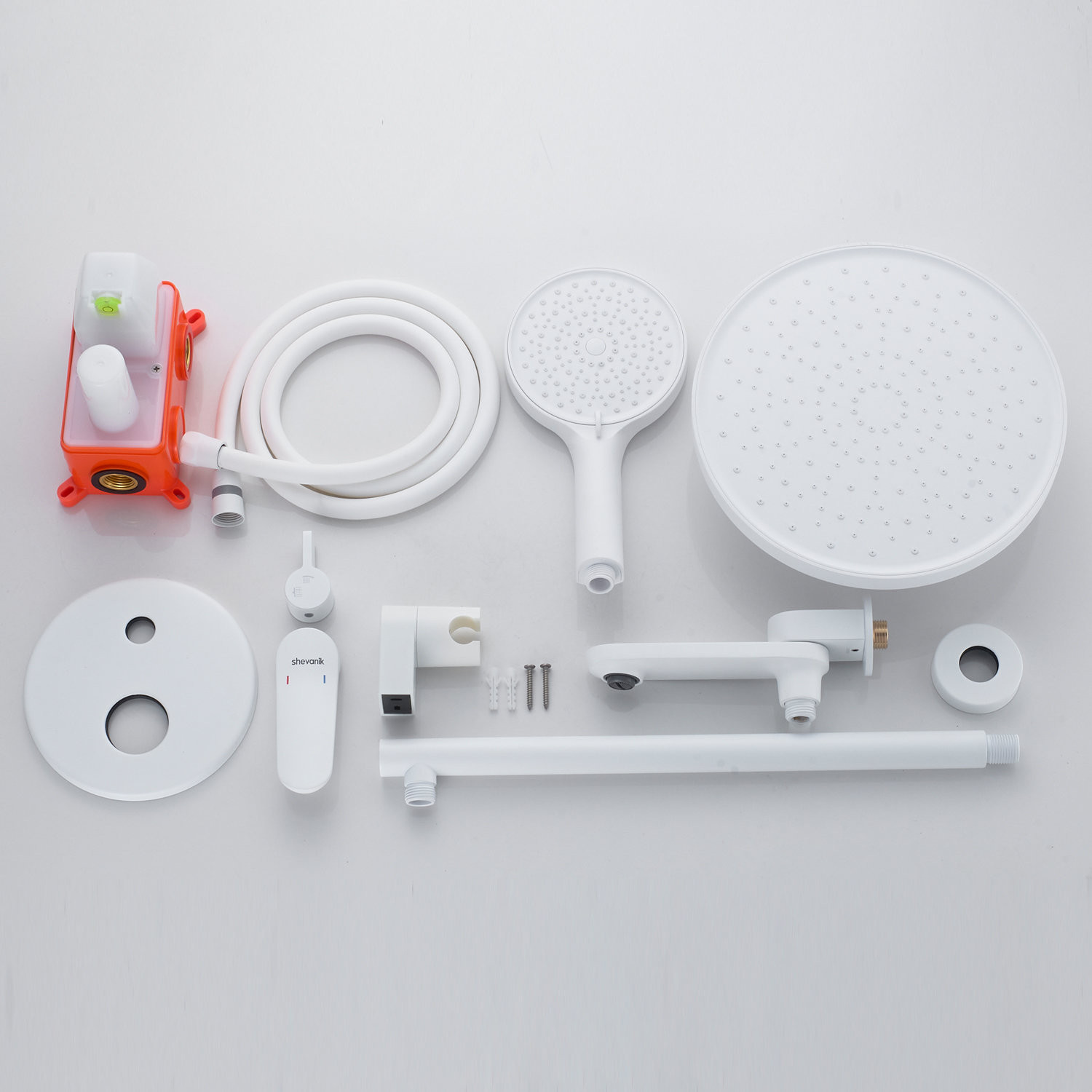 Комплектация: смеситель, встраиваемая часть, шланговое подключение с изливом, верхний душ с настенным кронштейном, душевой шланг, душевая лейка, настенный держатель лейки;