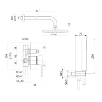 Комплектация: смеситель, внутренняя часть, верхний душ с кронштейном, душевая лейка, шланговое подключение, шланг;