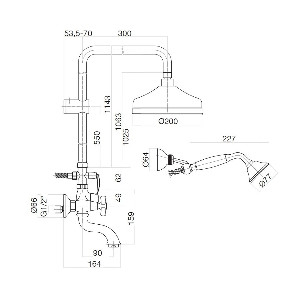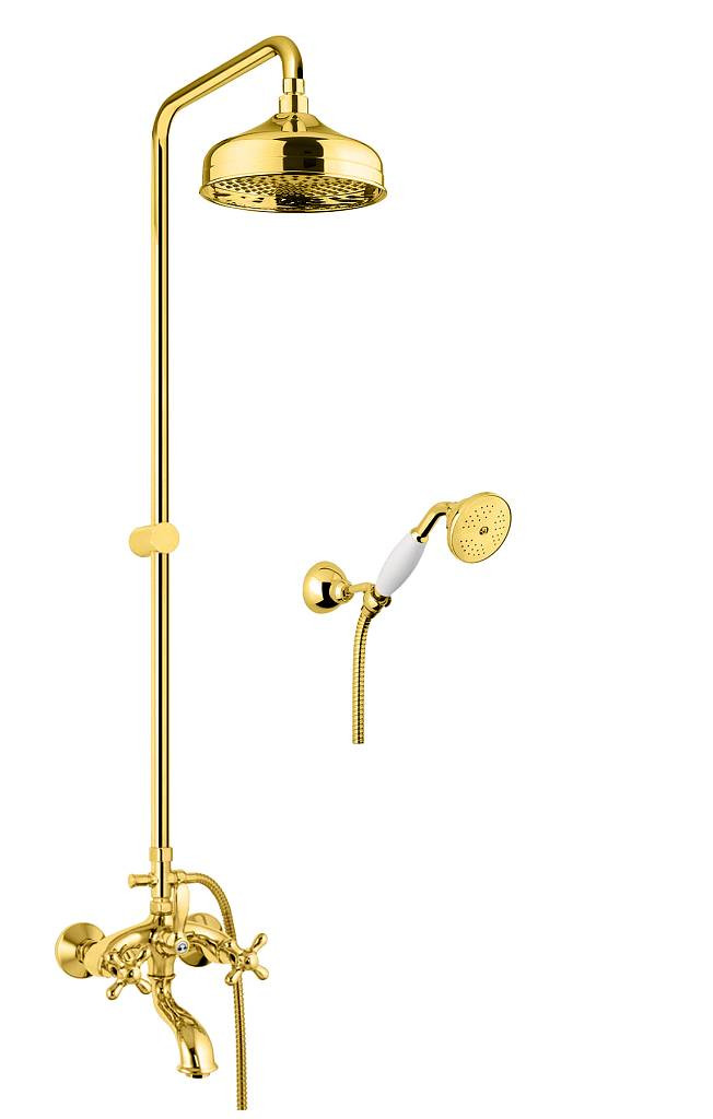 Комплектация: смеситель, верхний душ, душевая лейка, держатель душевой лейки, шланг, стойка;