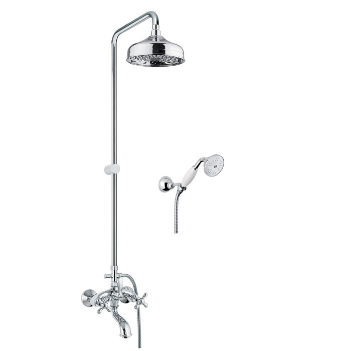 Комплектация: смеситель, верхний душ, душевая лейка, держатель душевой лейки, шланг, стойка;