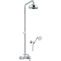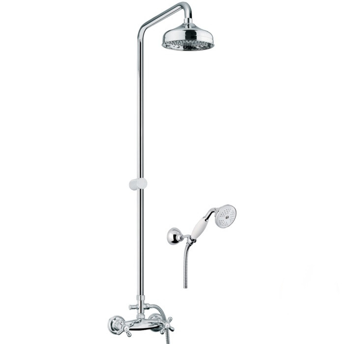 Комплектация: смеситель, верхний душ, душевая лейка, держатель душевой лейки, шланг, стойка;