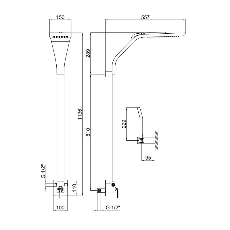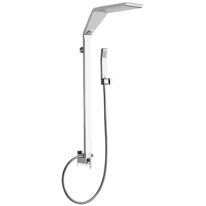 Комплектация: смеситель, внутренняя часть, стойка с верхним душем, душевая лейка, держатель лейки, шланг;