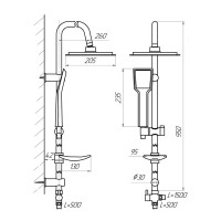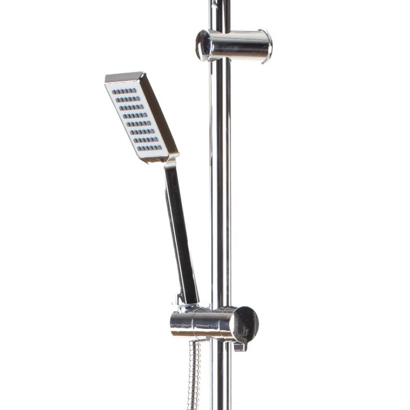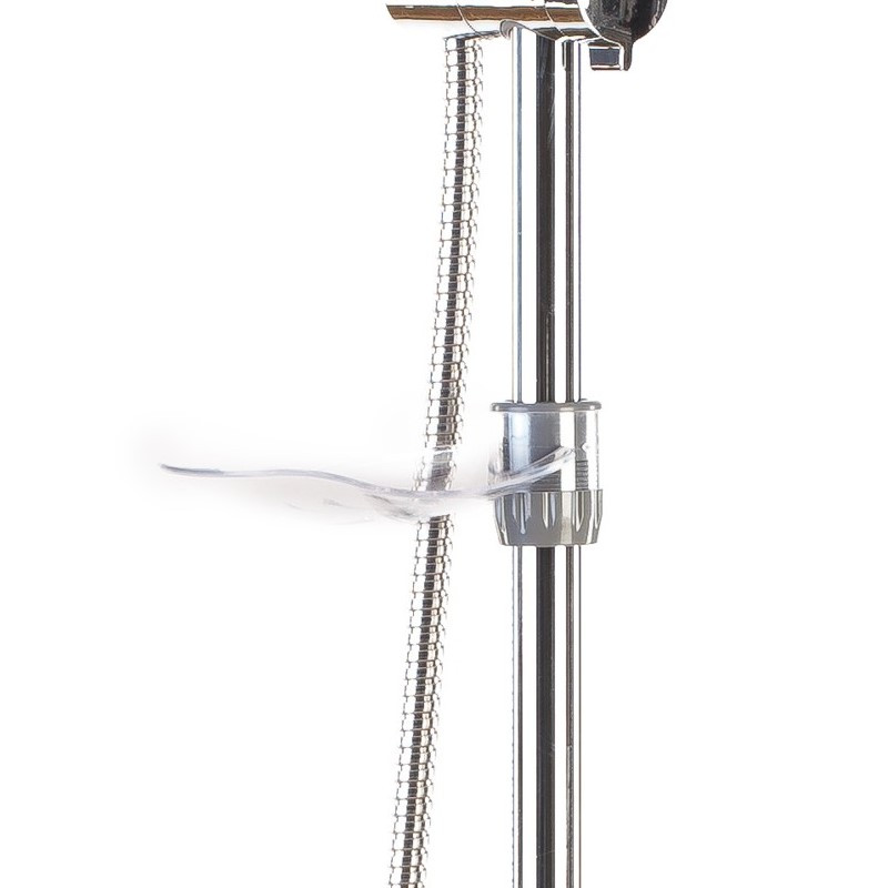 Комплектация: штанга, верхний душ, душевая лейка, держатель лейки, мыльница, шланг, крепления;