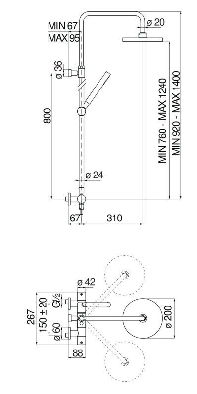 VE125030/50CR VELIS термостатическая душевая система, верхний душ 20 см