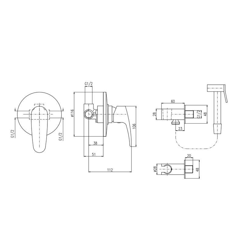 Комплектация: смеситель, лейка, шланговое подключение с держателем лейки, шланг, внутренняя часть;