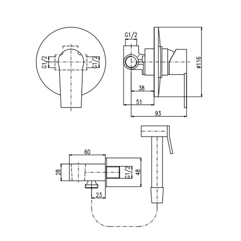 Комплектация: смеситель, лейка, шланговое подключение с держателем лейки, шланг, внутренняя часть;