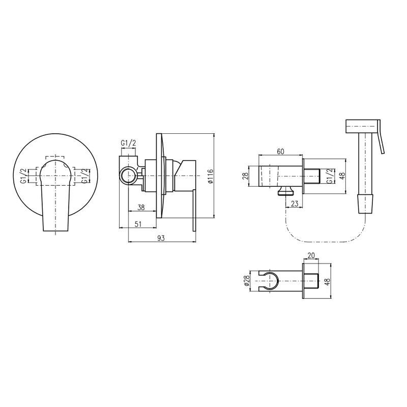 Комплектация: смеситель, лейка, шланговое подключение с держателем лейки, шланг, внутренняя часть;