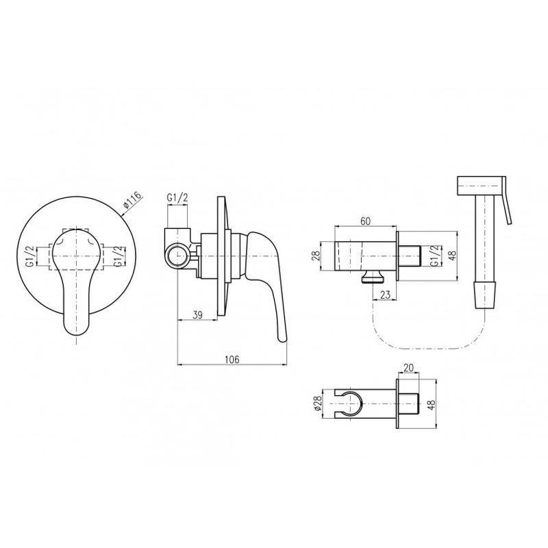 Комплектация: смеситель, лейка, шланговое подключение с держателем лейки, шланг, внутренняя часть;