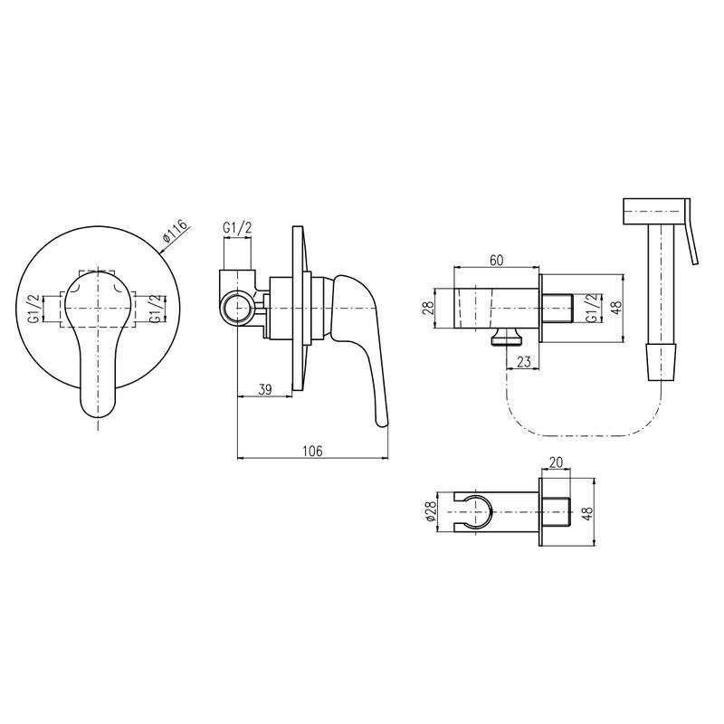 Комплектация: смеситель, лейка, шланговое подключение с держателем лейки, шланг, внутренняя часть;