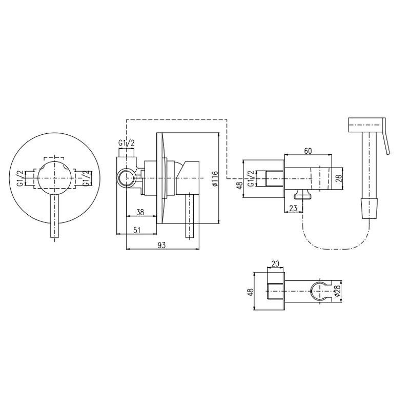Комплектация: смеситель, лейка, шланговое подключение с держателем лейки, шланг, внутренняя часть;