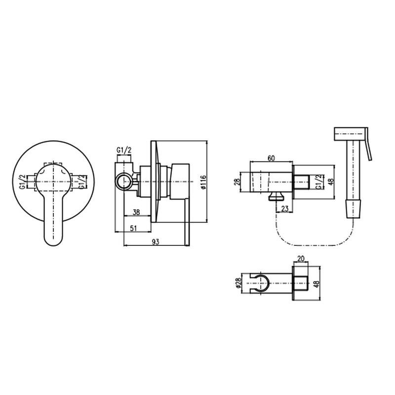 Комплектация: смеситель, лейка, шланговое подключение с держателем лейки, шланг, внутренняя часть;