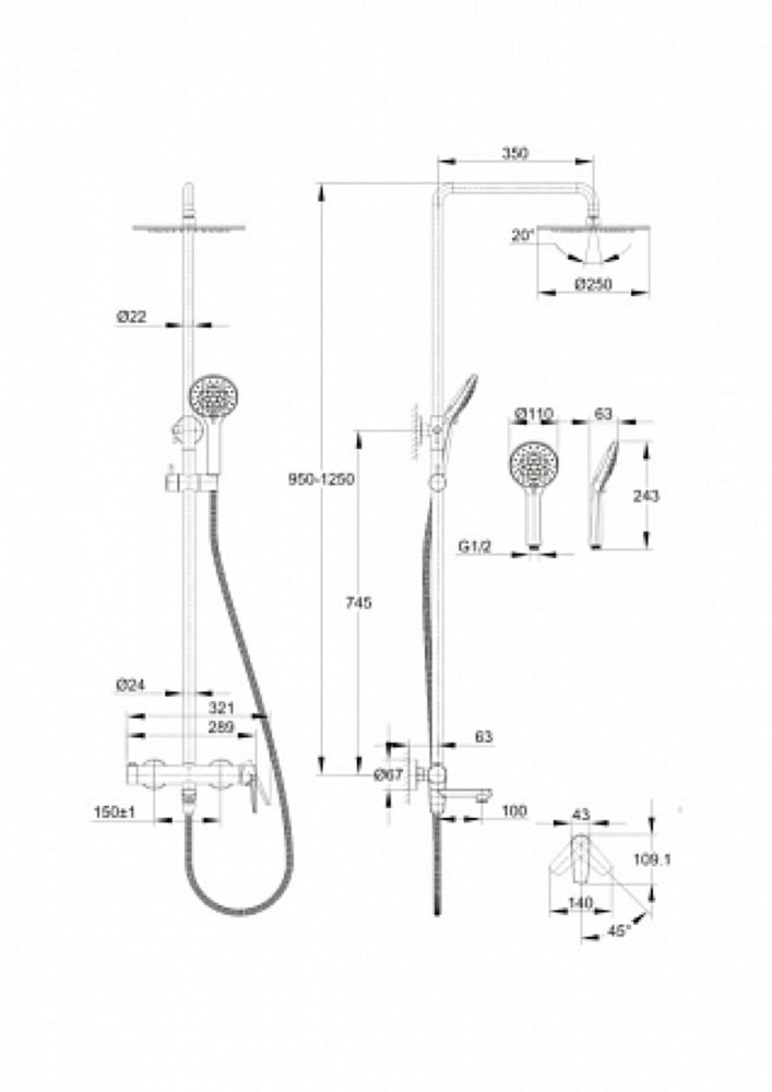 Душевая система Cersanit MODUO (смеситель стандартный) с изливом 5 режимов шланг 150 металл