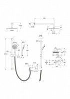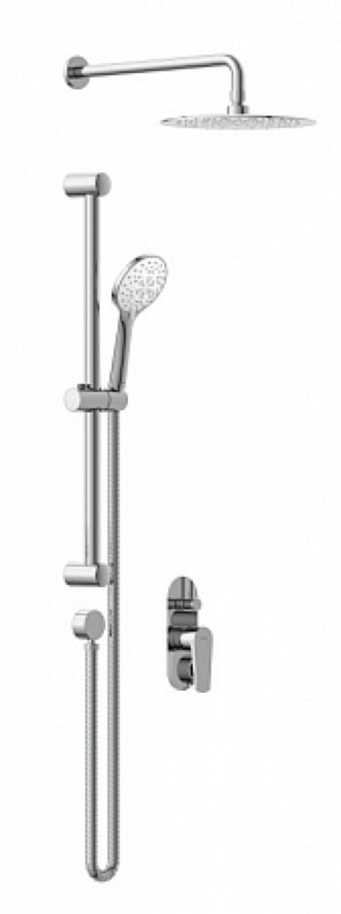 душевой набор (тропический душ, лейка, рейлинг, душевой шланг в металлической оплетке), смеситель с пластиковым коробом, рукоятка, декоративная накладка, настенный держатель для тропического душа, инструкция по эксплуатации, паспорт изделия с гарантийным талоном