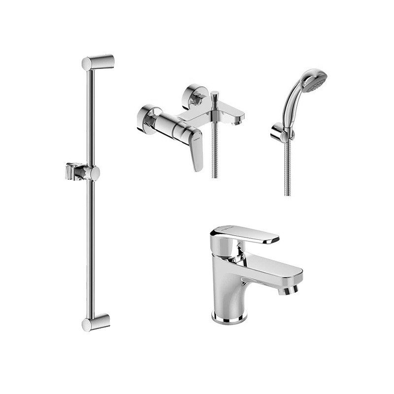 ПРОМО НАБОР: VIDIMA BALANCE Смеситель для умывальника, система монтажа EASY-FIX (облегченный монтаж), литой излив 107 мм, аэратор PERLATOR, металлическая рукоятка, индикатор холодной/горячей воды, подводка гибкая G1/2", шланги стандартной длины 400 мм + VIDIMA BALANCE Настенный смеситель для ванны/душа, монтаж на стандартных эксцентриках (в комплекте: эксцентрики, металлические отражатели, уплотнительные прокладки) SmartFix, литой излив 154-161 мм, аэратор PERLATOR, керамический картридж 35 мм, металлическая рукоятка, индикатор холодной/горячей воды, переключение ванна/душ -ручное (позволяет использовать функцию "душ" даже при очень низком давлении воды), душевой гарнитур в комплекте (душевая лейка Ø70 мм, металлический шланг 1500 мм, держатель для лейки) + VIDIMA FRESH S Штанга для душа 600 мм (+/-5 мм), Ø 18 мм, пластиковый держатель лейки, регулировка наклона лейки