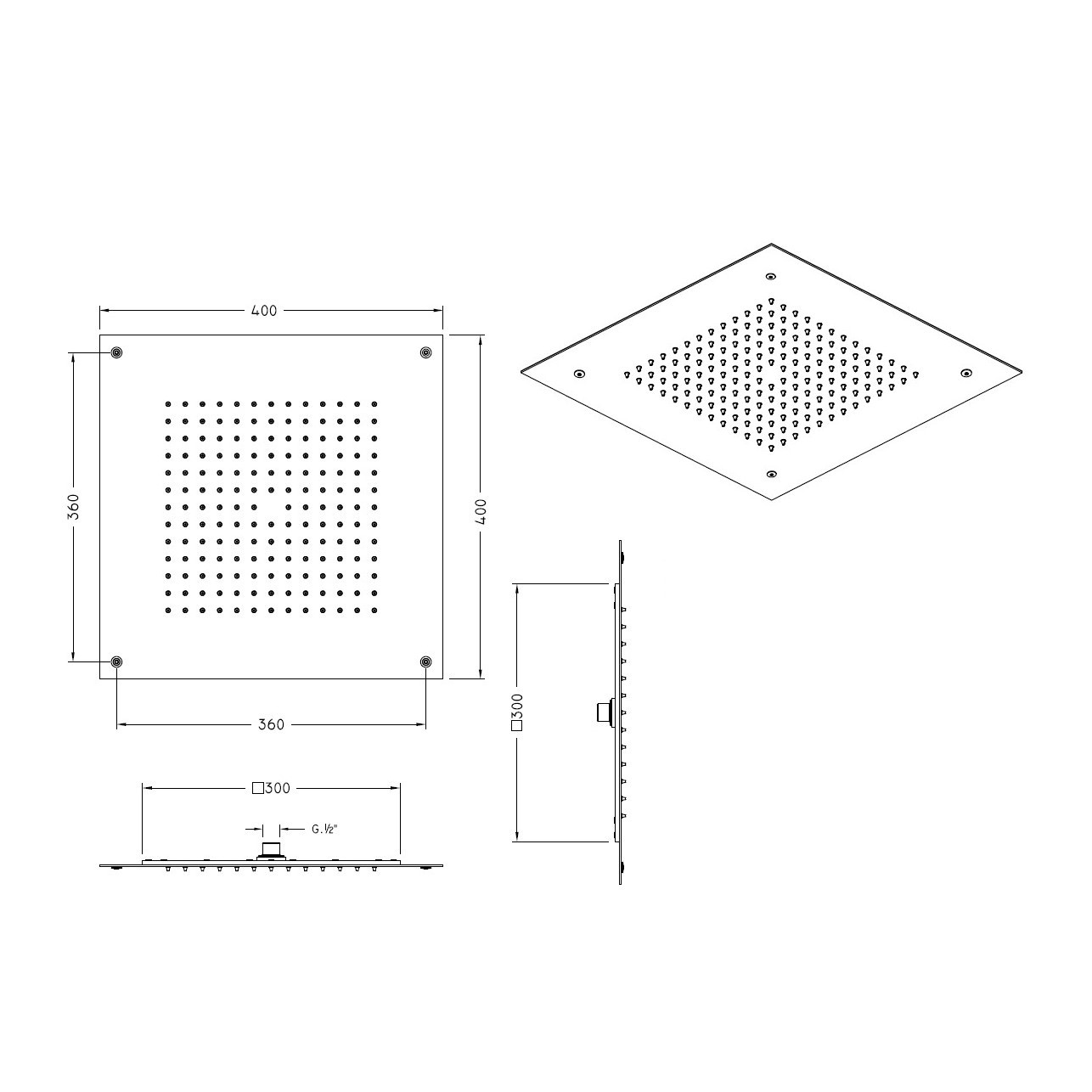 Комплектация: Верхний душ, система крепежа с тровами, инстрцкция, установочный трафарет;