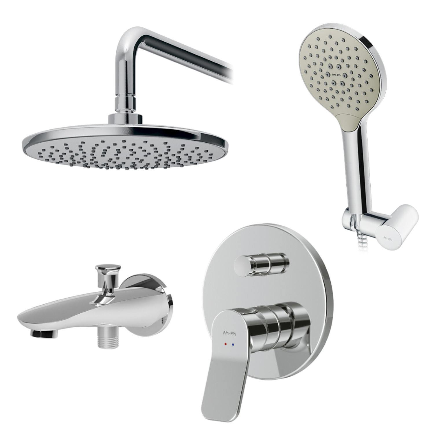 Набор: смеситель для ванны и душа, верхний душ с держателем, душевой набор и излив на ванну