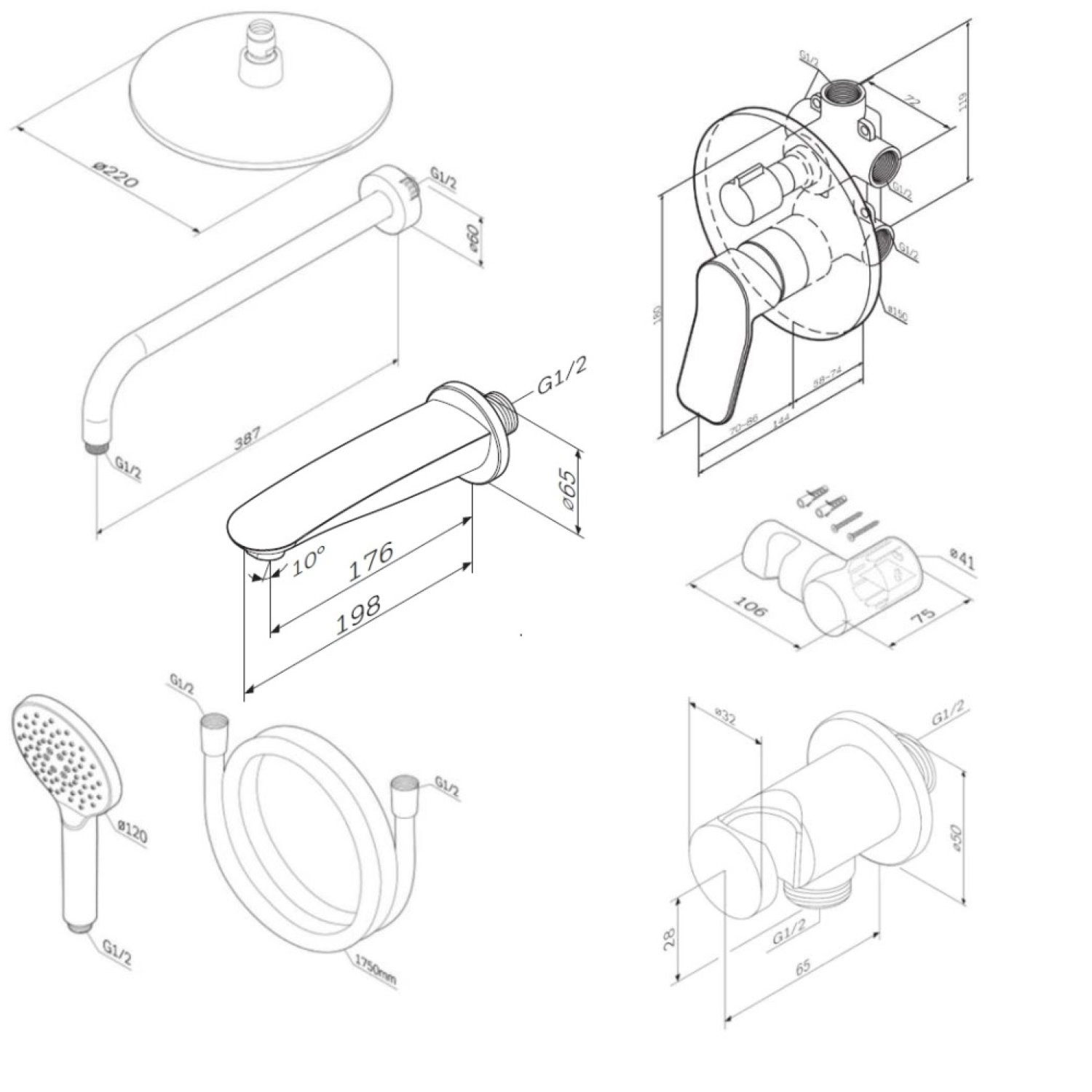 Набор: смеситель для ванны и душа, верхний душ с держателем, излив, душевой набор и шланговое присоединение