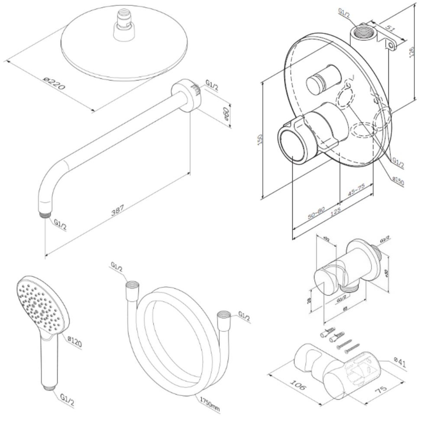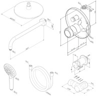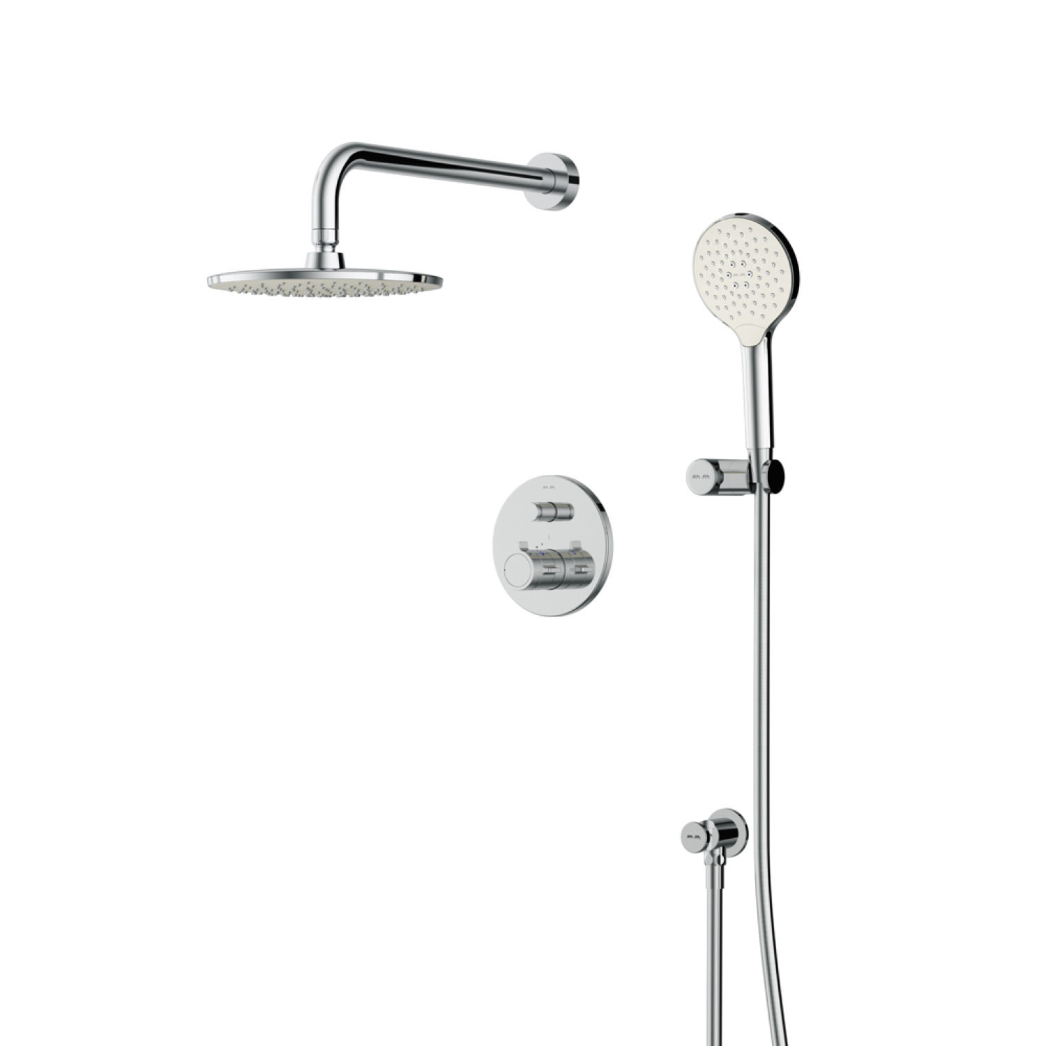 Набор: смесительс термостатом на 2 потребителя, верхний душ с держателем, душевой набор и шланговое присоединение