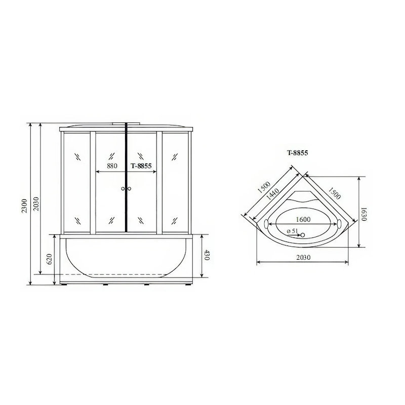 Комплектация: душевая кабина с радио, вентилятор, зеркало, полка, сиденье, верхний душ, подсветка;