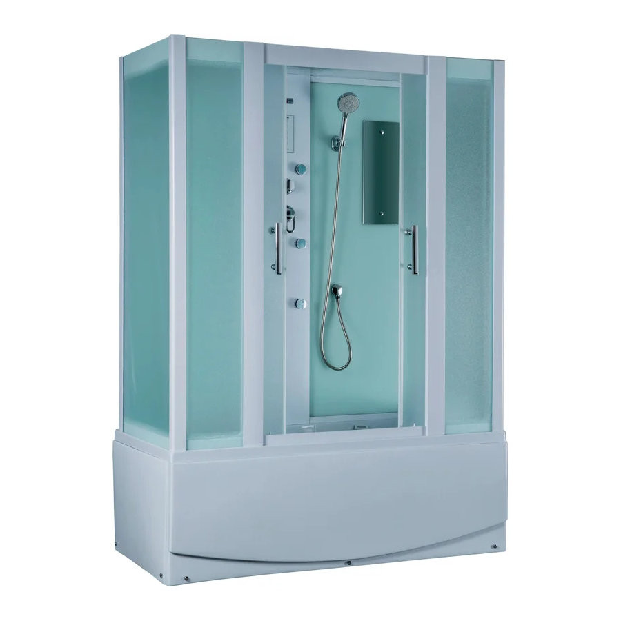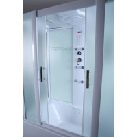 Комплектация: душевая кабина с поддоном, смеситель с душевым гарнитуром, тропический душ, зеркало, полки, радио;