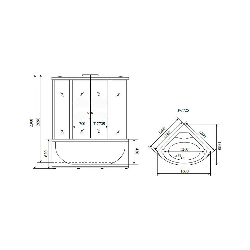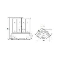 Комплектация: душевая кабина с ручным душем, верхний душ, подсветка, радио, сиденье, вентилятор, зеркало, полка;