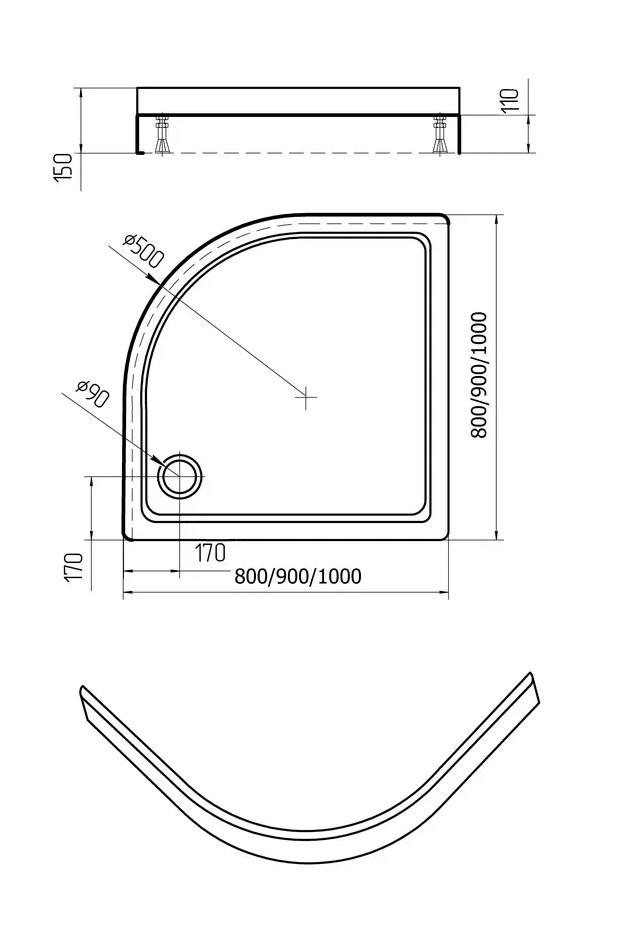 Поддон акриловый, 1/4 круга, с ножками и съемной панелью. БЕЗ СИФОНА. 90*90*15