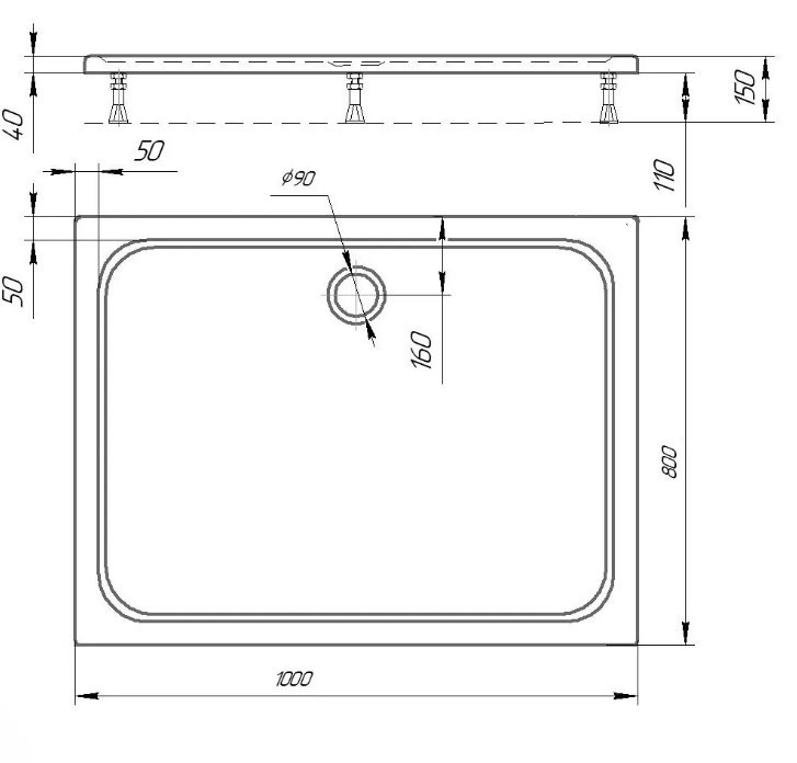 Поддон акриловый, прямоугольный, с ножками и съемной панелью. БЕЗ СИФОНА. 100*80*15