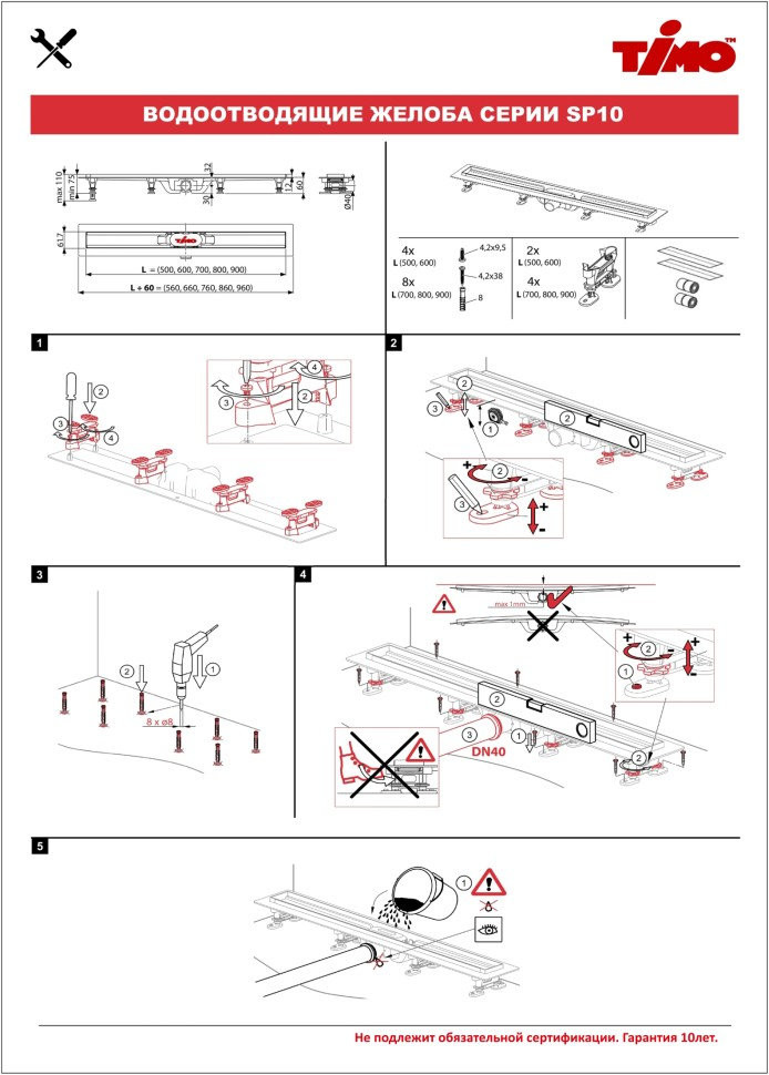 Комплектация: пластиковый водоотводящий желоб с порогами из нержавеющей стали; встроенный сифон DN40, выход вбок 90°; встроенный шариковый сухой затвор; декоративная вставка; комплект регулируемых опор; улавливатель волос и мусора; гидроизоляционная лента; сервисный ключ.;