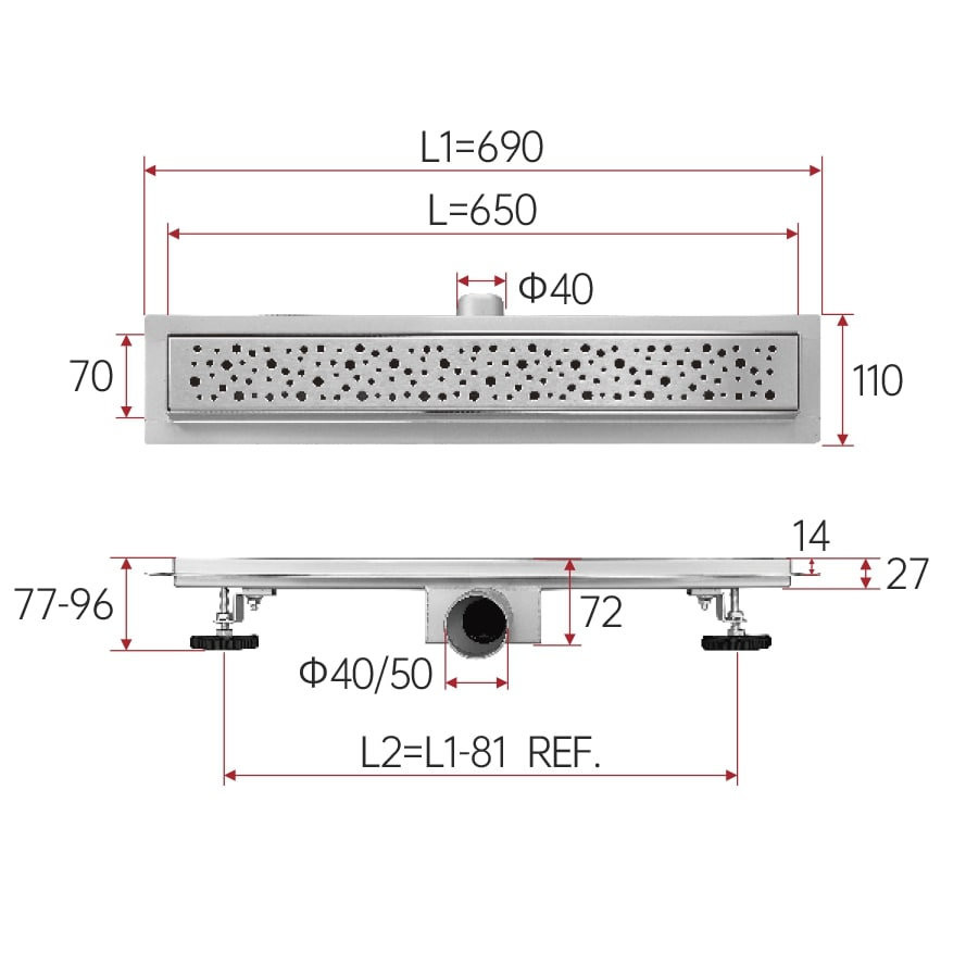 Комплектация: корпус душевого лотка, решетка, сифон, регулируемые ножки;
