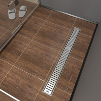 Комплектация: пластиковый водоотводящий желоб с порогами из нержавеющей стали; встроенный сифон DN40, выход вбок 90°; встроенный шариковый сухой затвор; декоративная вставка; комплект регулируемых опор; улавливатель волос и мусора; гидроизоляционная лента; сервисный ключ.;