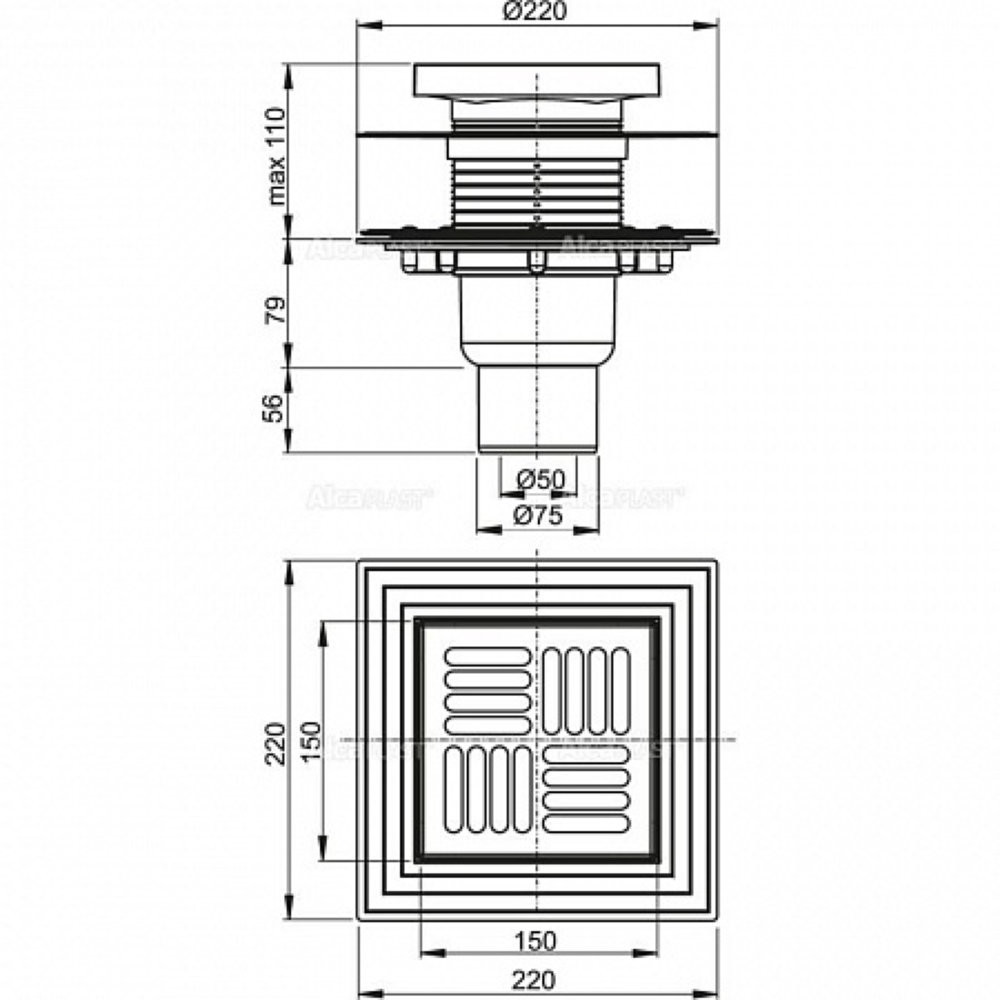 Сливной трап 150 × 150/50/75, подводка – прямая, решетка – нерж. сталь, фланец –нерж., арт.APV4444