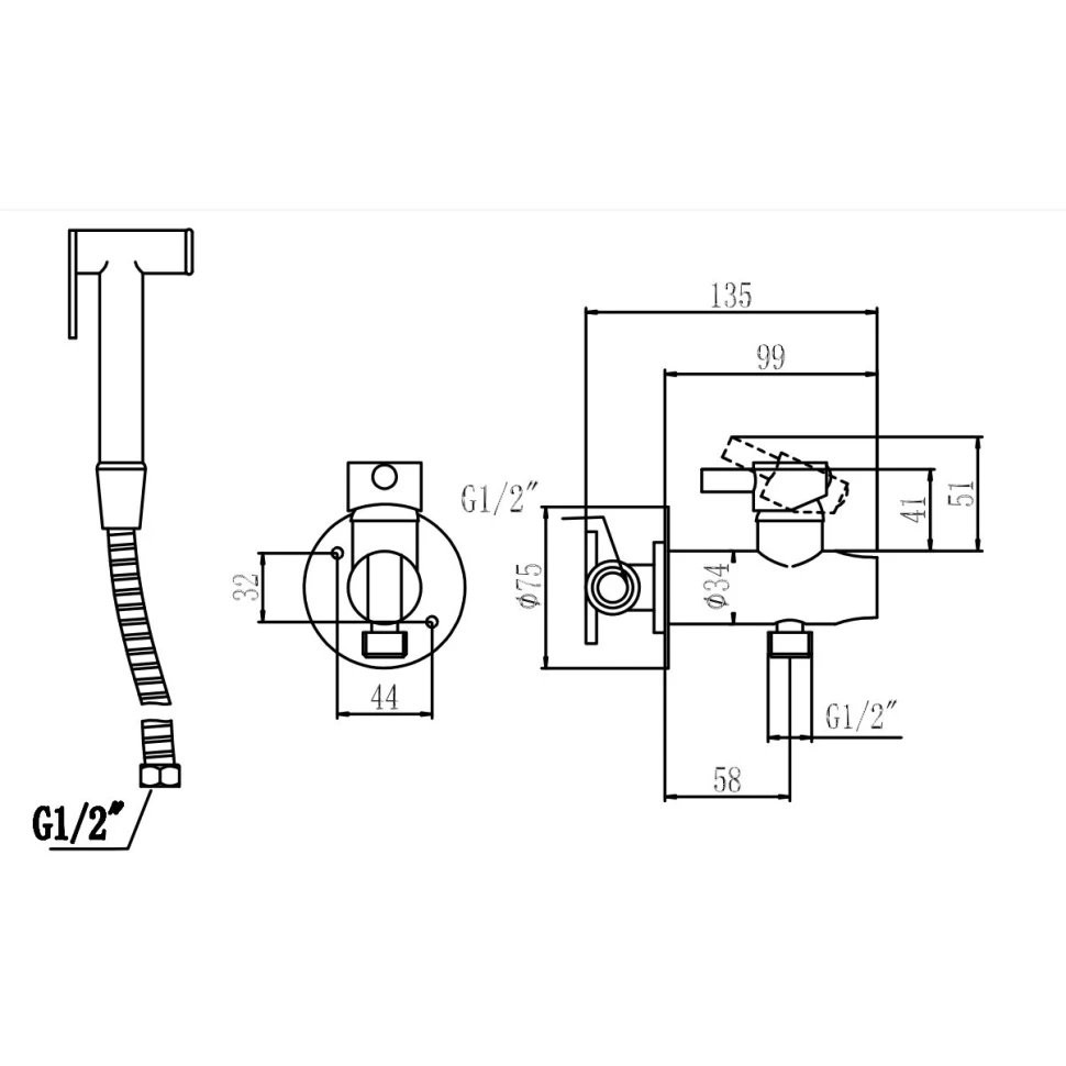 Комплектация: смеситель, шланг, лейка, скрытая монтажная часть;