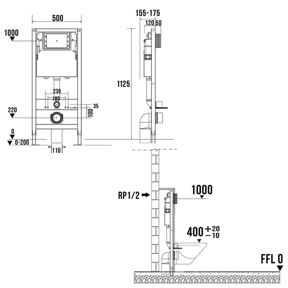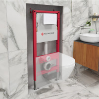 Комплектация: Система инсталляции (рама, бачок со встроенной арматурой, патрубки подачи воды и канализации), Шумоизоляция, Комплект крепежа для установки инсталляции и крепежные шпильки для установки унитаза, Клавиша смыва;