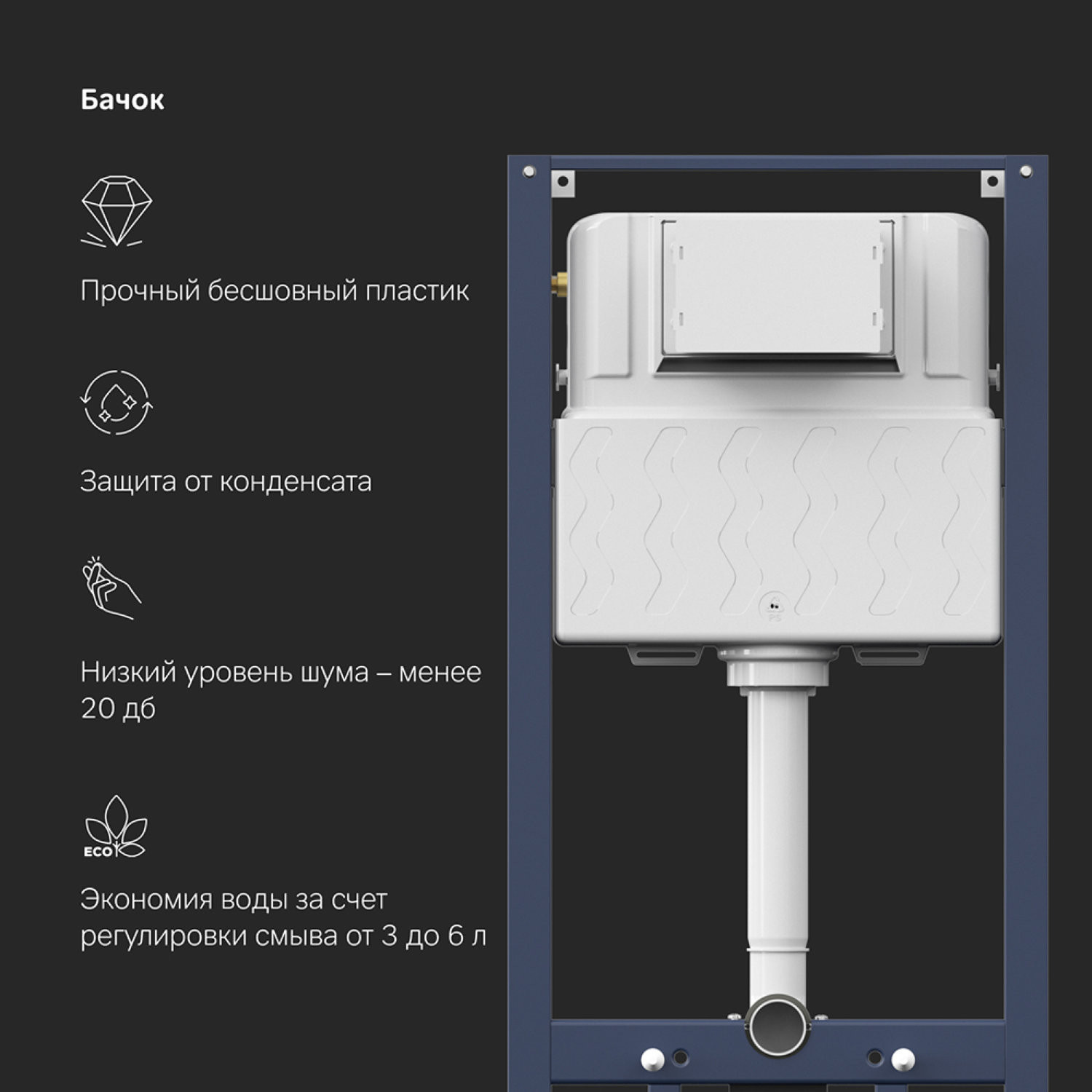 Максимально полная комплектация - все необходимые крепления, патрубки, звукоизолирующая прокладка в комплекте. Вертикальные ребра жесткости в конструкции рамы – дополнительная опора в месте давления керамики на стену. Благодаря им инсталляция более универсальная и подходит для унитазов любых размеров, включая унитазы с небольшой контактной поверхностью. Нет необходимости докупать дополнительные аксессуары для монтажа таких унитазов. Высокая прочность и износостойкость. Выдерживает нагрузку до 400 кг. Цельный бесшовный бачок из полиэтилена с защитой от конденсации. Комфортное использование благодаря заливному клапану с низким уровнем шума - менее 20 Дб. |
