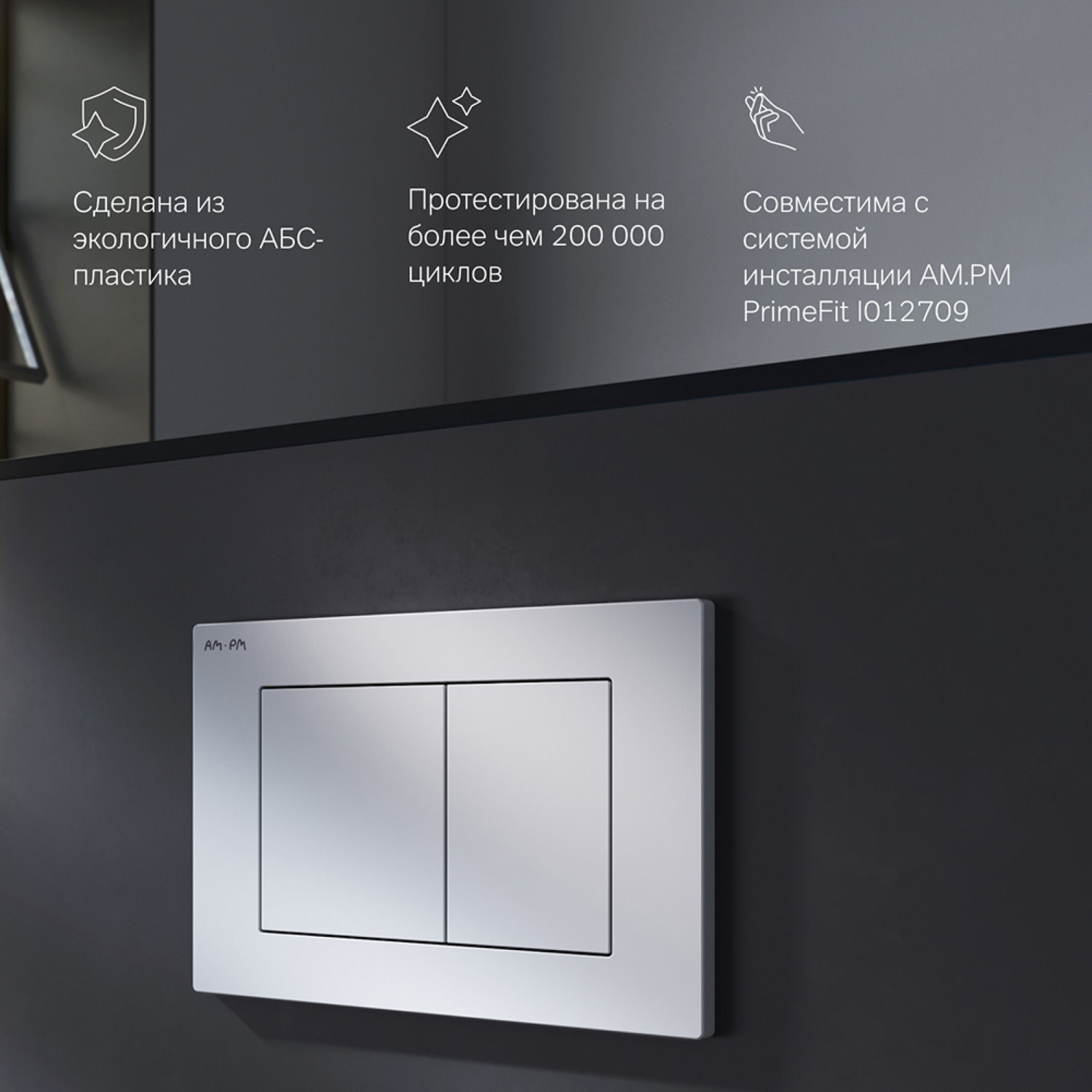 Двойной смыв - 3/6 л. Механический принцип работы, все крепления в комплекте. Клавиша подходит для инсталляции AM.PM PrimeFit I012709. |