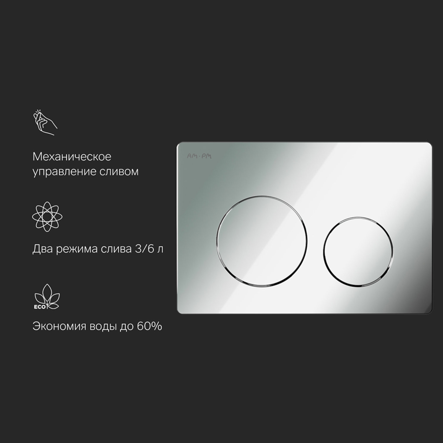 Двойной смыв - 3/6 л. Механический принцип работы, все крепления в комплекте. Клавиша подходит для инсталляции AM.PM PrimeFit I012709. |