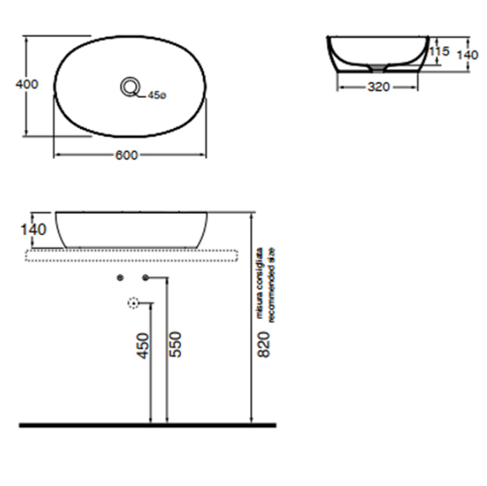 Раковина 60х40 см, без отв., накладная, цвет: белый