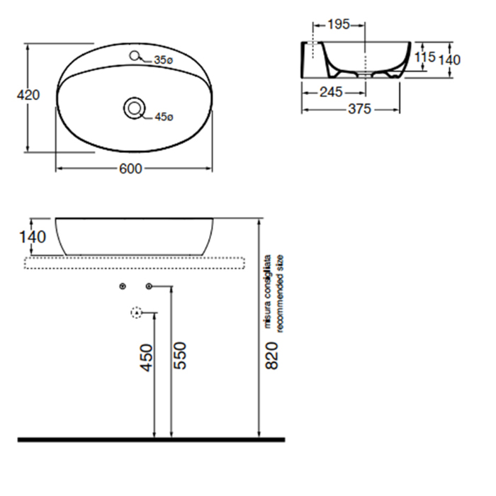 Раковина 60х42 см, 1 отв., накладная, цвет: белый