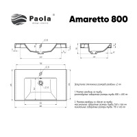 Врезная раковина Paola Amaretto 800 имеет современный, стильный и эргономичный дизайн. Данная мебельная раковина устанавливается на тумбу (со свесом или вровень). Раковина изготовлена из прочного износостойкого литьевого мрамора со специальным химически стойким защитным покрытием гелькоутом.